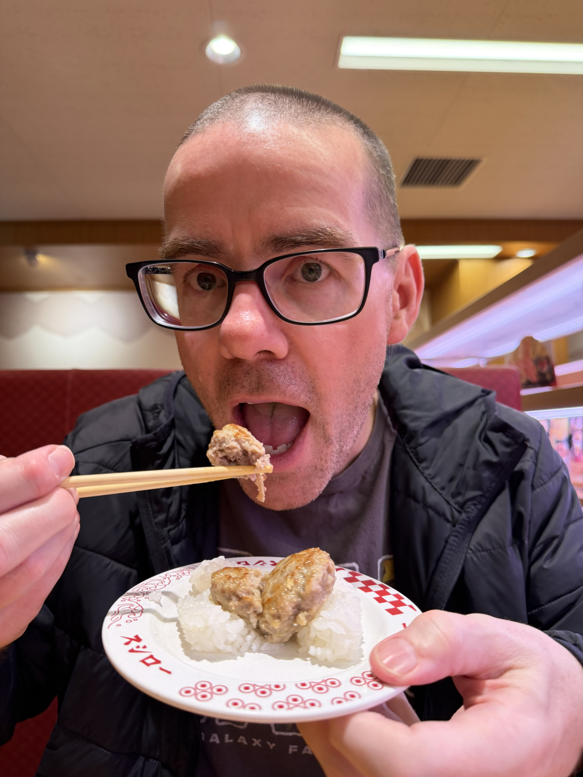 I’m eating my favourite: hamburger sushi. Made with beef. But not, I suspect, the type of beef most tourists visit Kobe to eat: