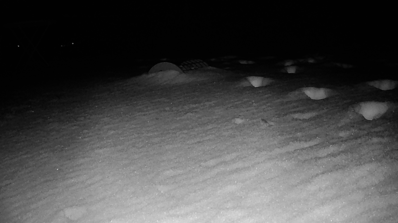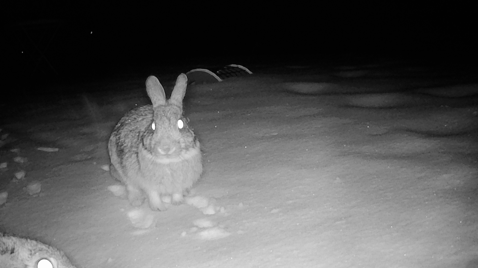 There were also many – hundreds – of rabbit photos, all of which were at night in the snow. As you see there’s two in the above shot (taken early January), but what also caught my eye are the footprints in the top right. Here’s a better photo of them from a few days earlier: