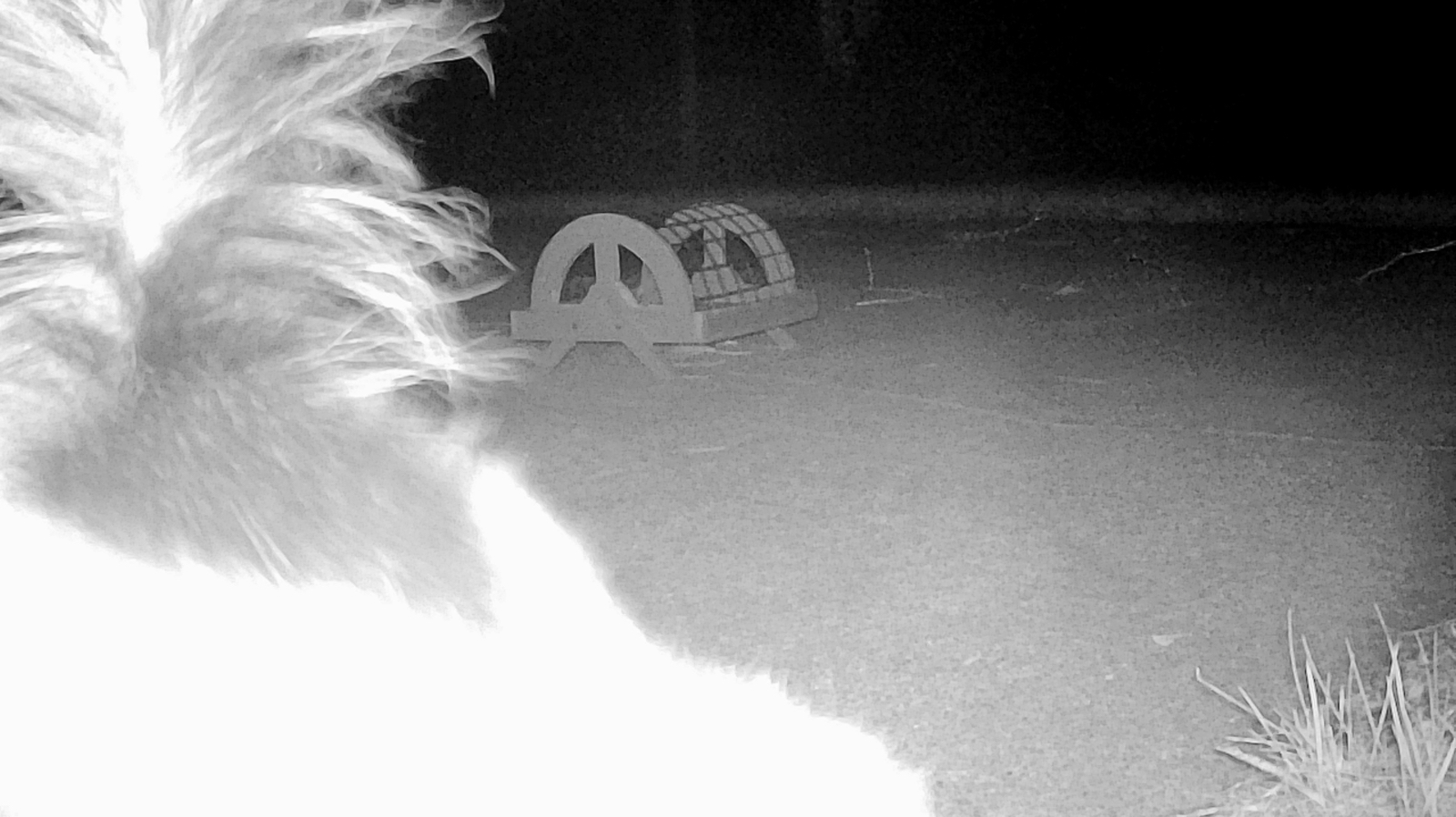 And lastly this skunk visited us one night! There were a half dozen or so pics of it, all at very close range so his face was never visible. The camera is right next to the house so he came very close. I wonder if Loppi (who often monitors the yard from a window perch) saw him?
