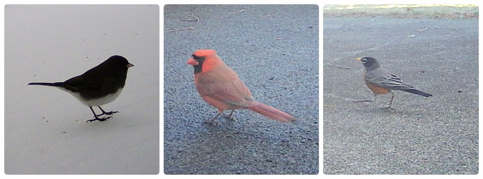 Birds are also somewhat rare on these photos, but here we see a mystery bird, a cardinal and a robin. Can anyone identify the one on the left.