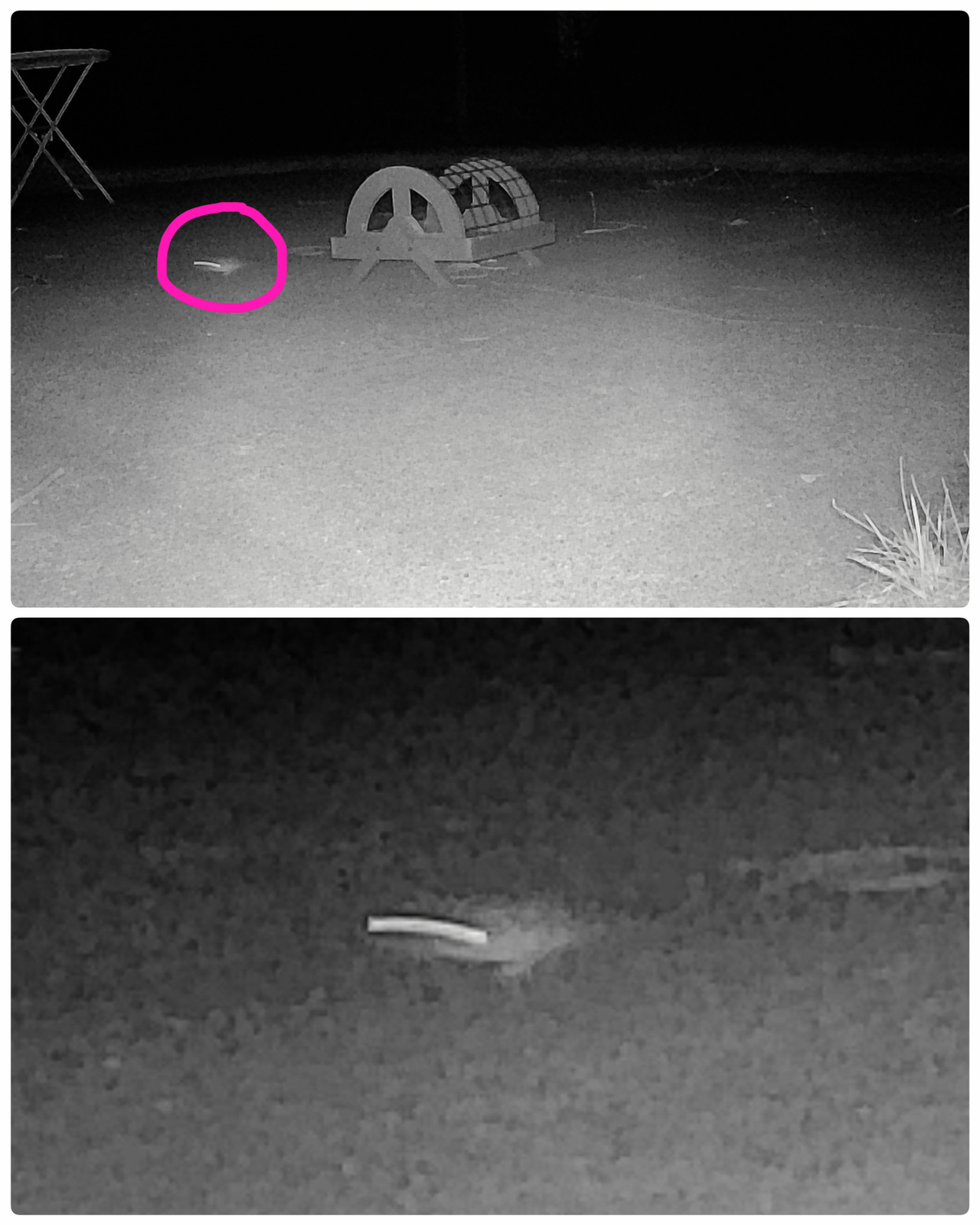 Such as whatever the above is? This is too small for a chipmunk so I assume some sort of mouse, and as we can tell from the blur it was legging it past the feeder. The white streak is its eye reflecting the UV light from the camera.