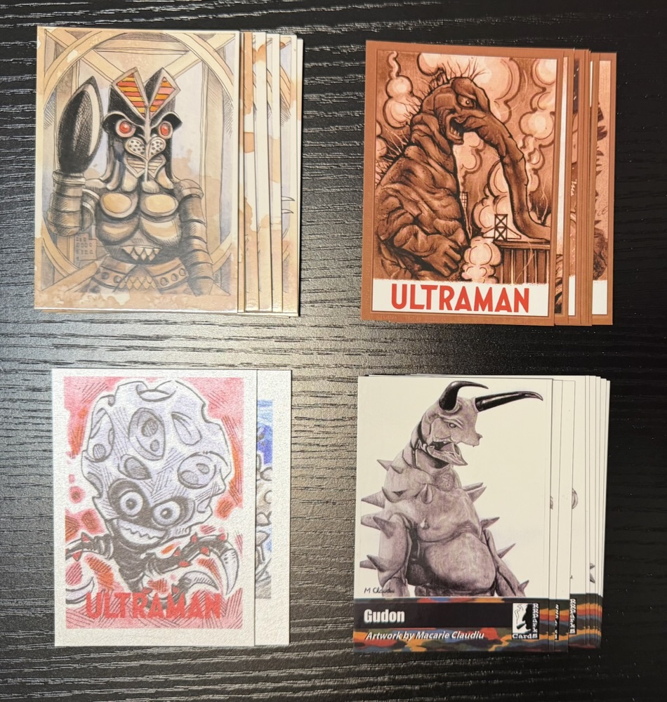 I was very lucky to get three original art cards. These are blank cards on which artists have drawn or painted an ultra character, and the three I got are shown above.