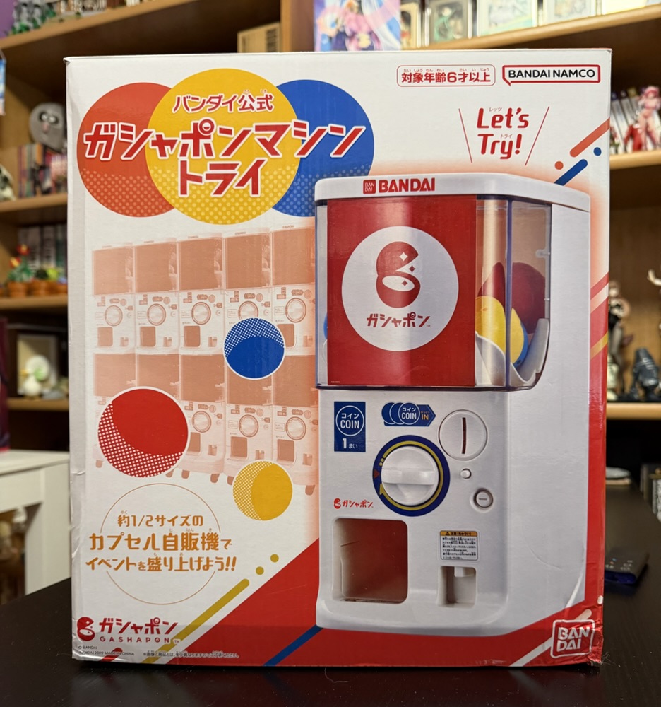 It’s a scaled-down version of the real machines and works identically. In addition to the machine itself, the box contained 9 empty gacha balls and four tokens.