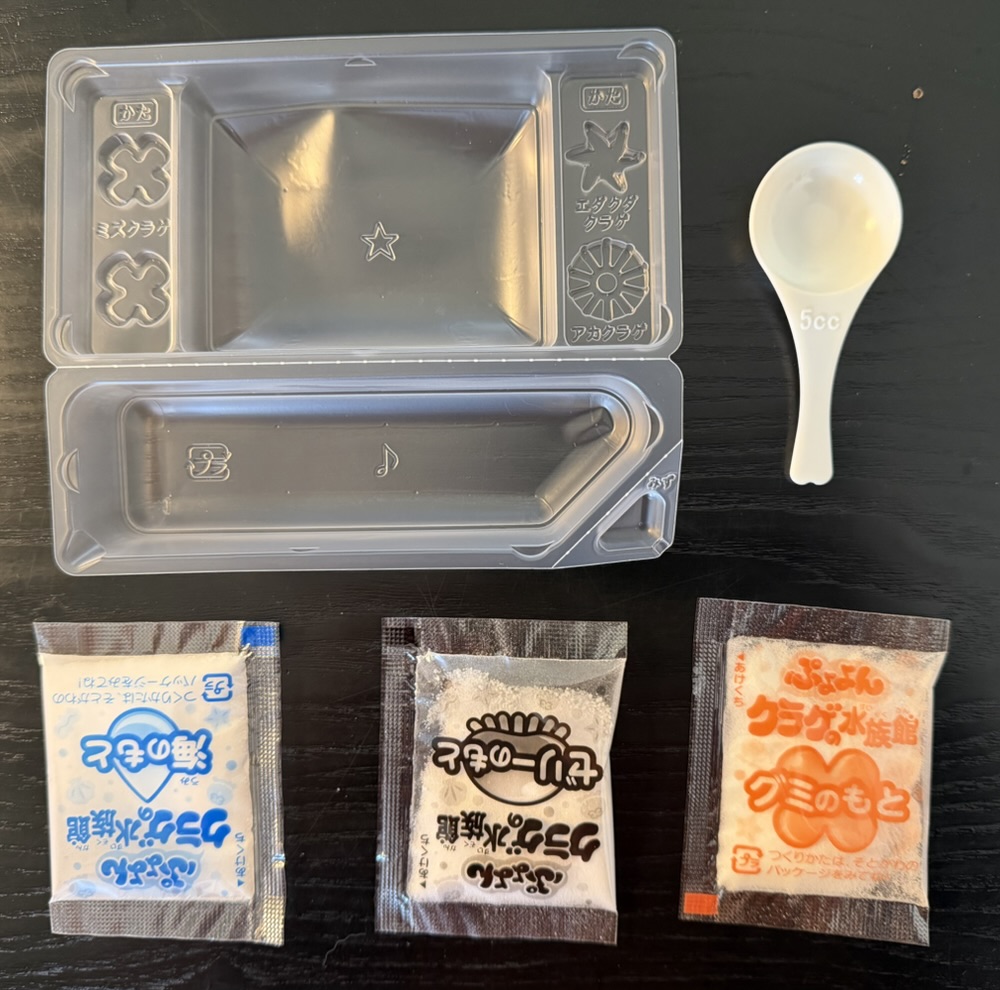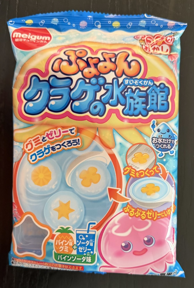 There’s the four jellyfish sealed in their slime bubbles suspended in the aquarium. Gummy inside slime inside liquid: what a complex and bizarre candy kit!