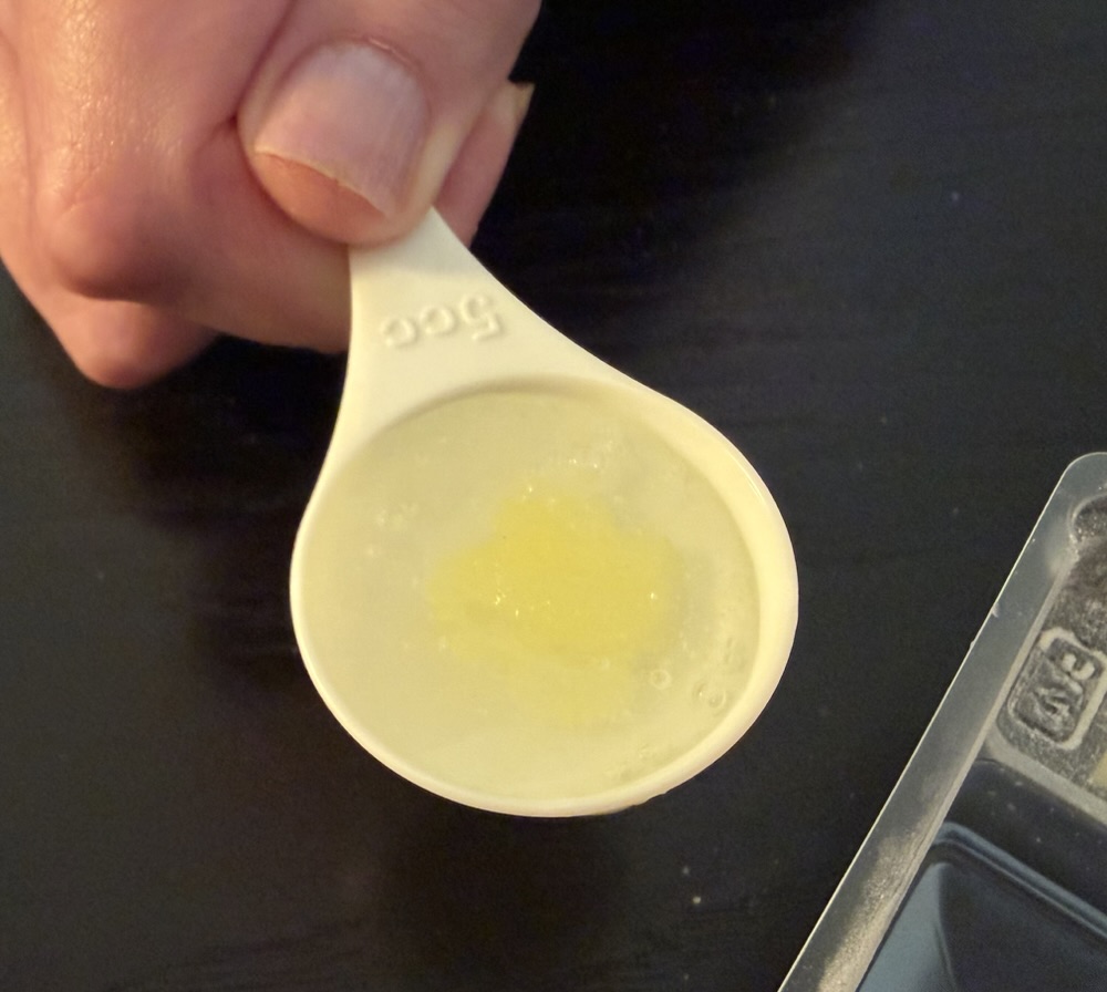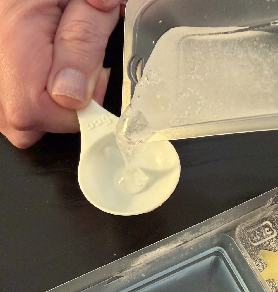 Next a second bag of powder was mixed with water to make this transparent slime. The packaging suggested it would be clear after enough mixing, but try as I did I couldn’t mix out all of the air bubbles. It had the consistency of shampoo or thick oil.
