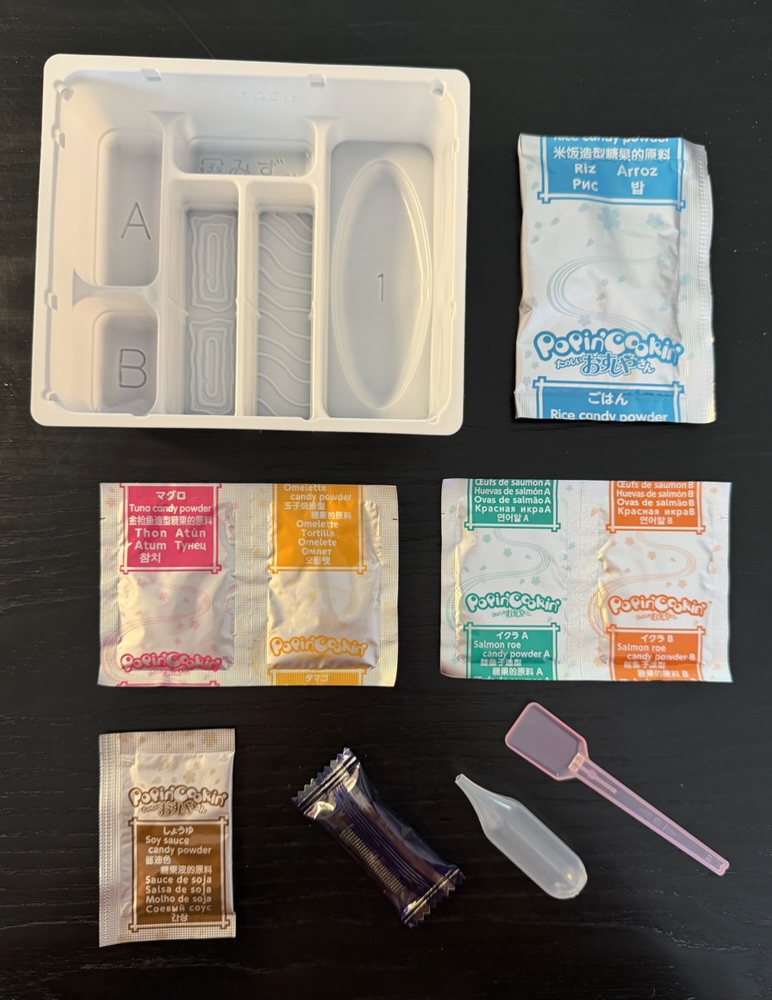 The seventh and final installment in this candy making series is another kit by Kracie: this sushi kit. Egg, tuna and salmon row sushi, all made of candy. Let’s go!