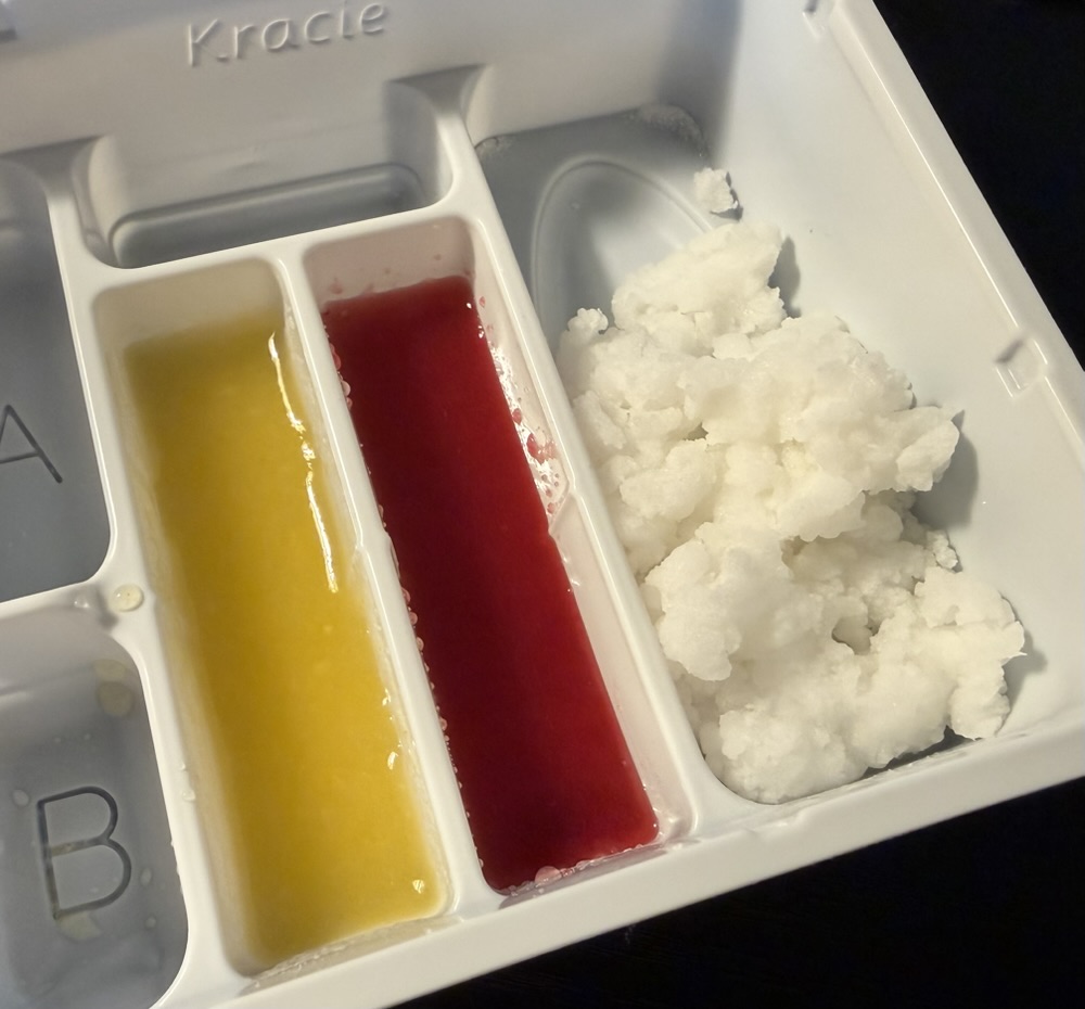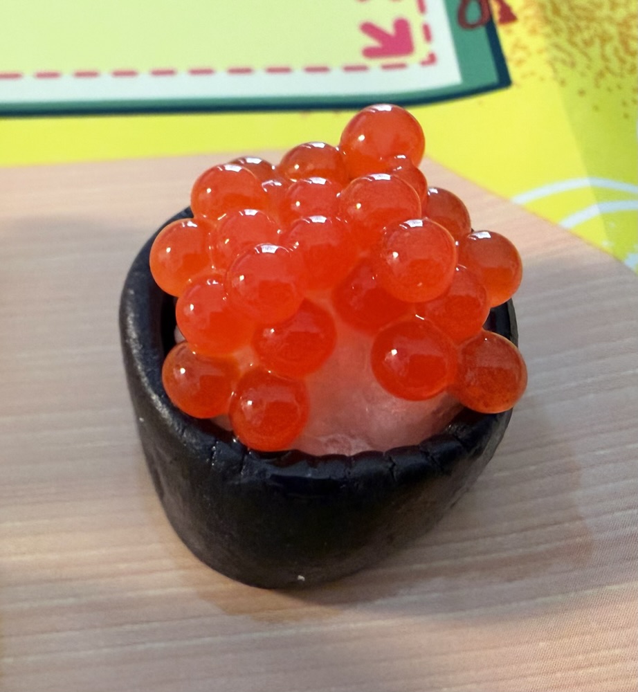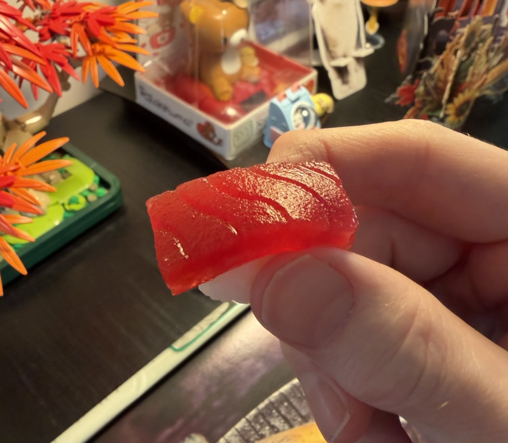 The egg and tuna were jellies formed in these two trays. The bottoms of the trays were textured, as you’ll see on the photos of the finished product below. They nailed the colours of both of these and they convincingly look like egg and tuna.