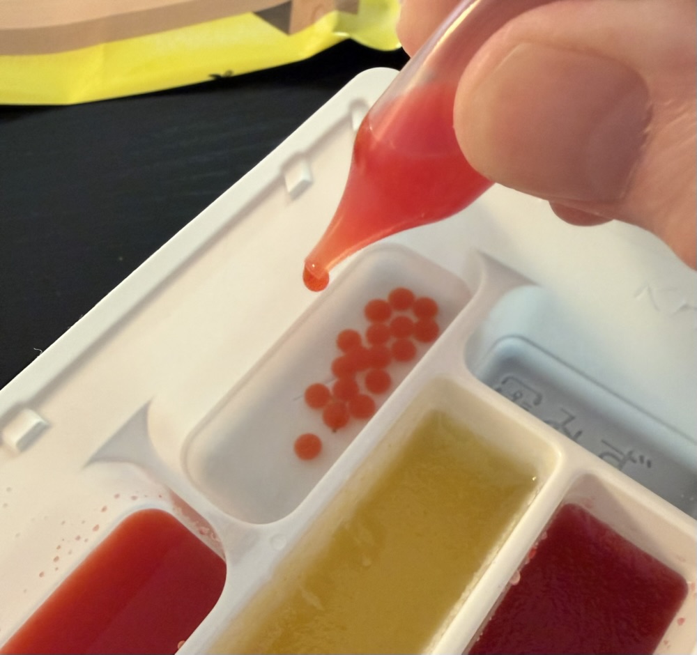 The amazing moment from this kit was the creation of the salmon roe. A powder was dissolved to form a red liquid which was then dropped into a tray containing another dissolved powder in which it solidified! The individual eggs could then be removed and used as the roe.