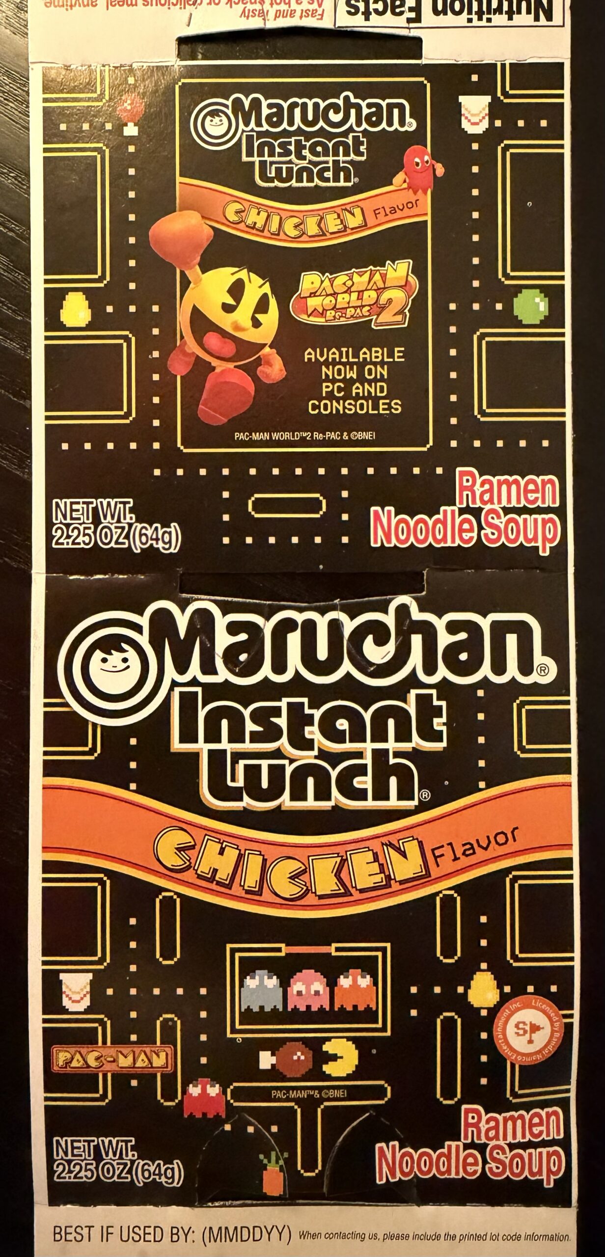 The above was a recent marketing promotion here in the USA. Maruchan brand chicken ramen instant noodles replaced their normal outer wrapper with a Pac-Man themed one. Here’s a detail of the Pac-Man portion of the wrapper: