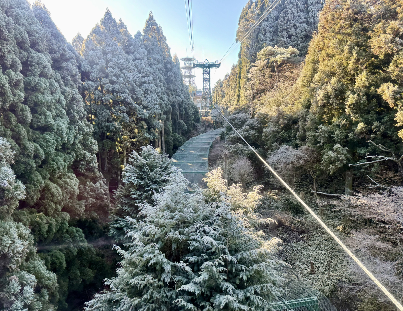 It takes twenty minutes to get to the top of Mount Rokko from the ropeway station at the mountain base, and as we climbed we noticed that sections of the forest were visibly light grey. This was due to frost, and it was a beautiful sight especially as we pulled into the station on the mountaintop.