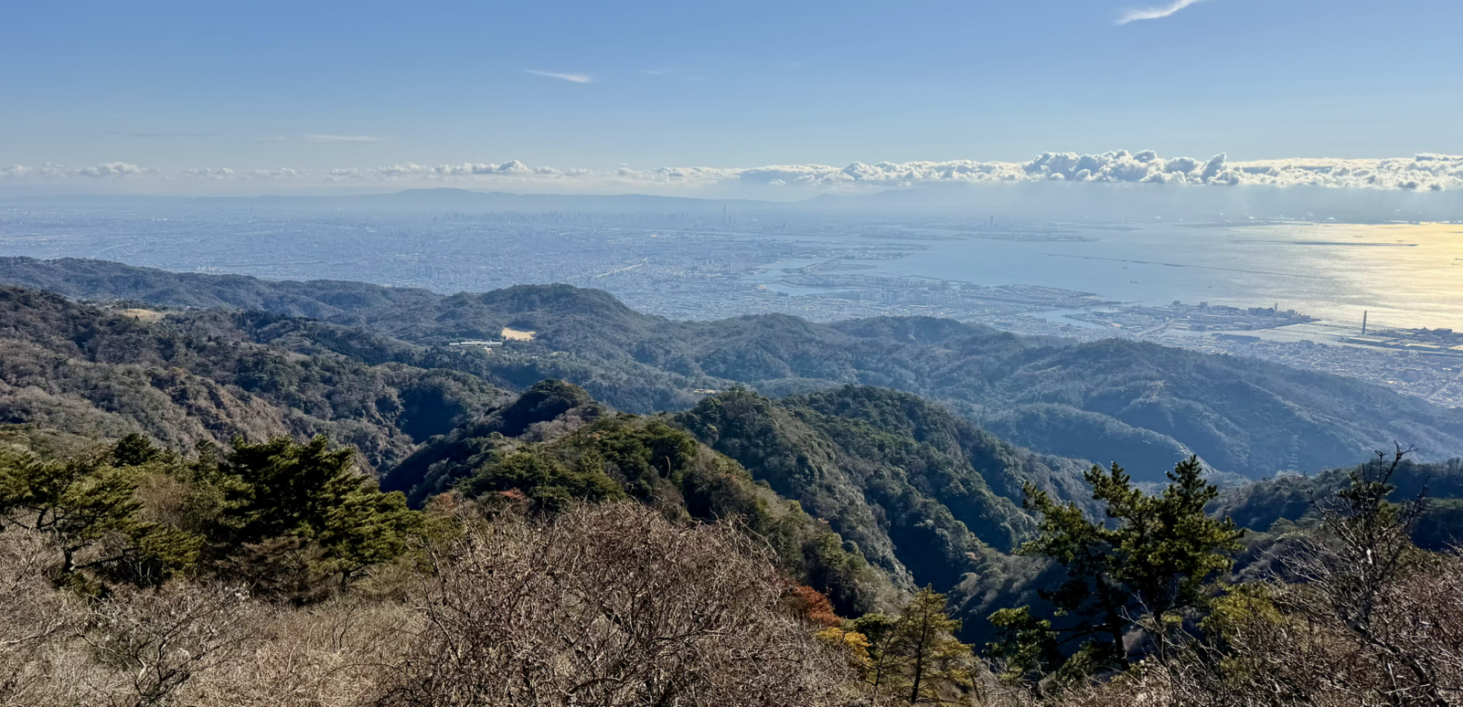 It’s a little unclear in the photo, but this shows Osaka and Kobe cities down at sea level and the Seto Inland Sea behind them. Both are destinations for us in the near future.