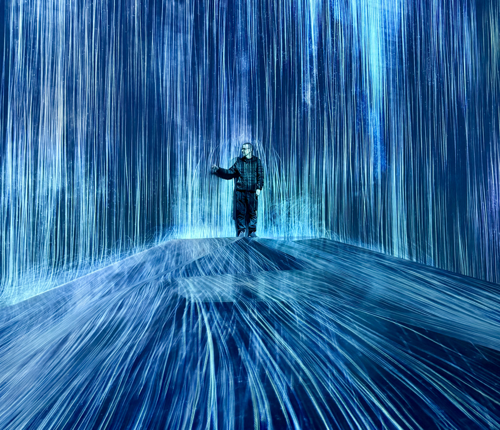 The second room is the largest and contains a rock on which water continuously falls and flows down into the room. Flowers occasionally bloom and float away, and birds fly around the room in wide arcs. It’s not real of course, just projected, but it is very convincing and reacts to people as they move around inside the room. For instance I went and stood atop the rock and the water flowed around me.