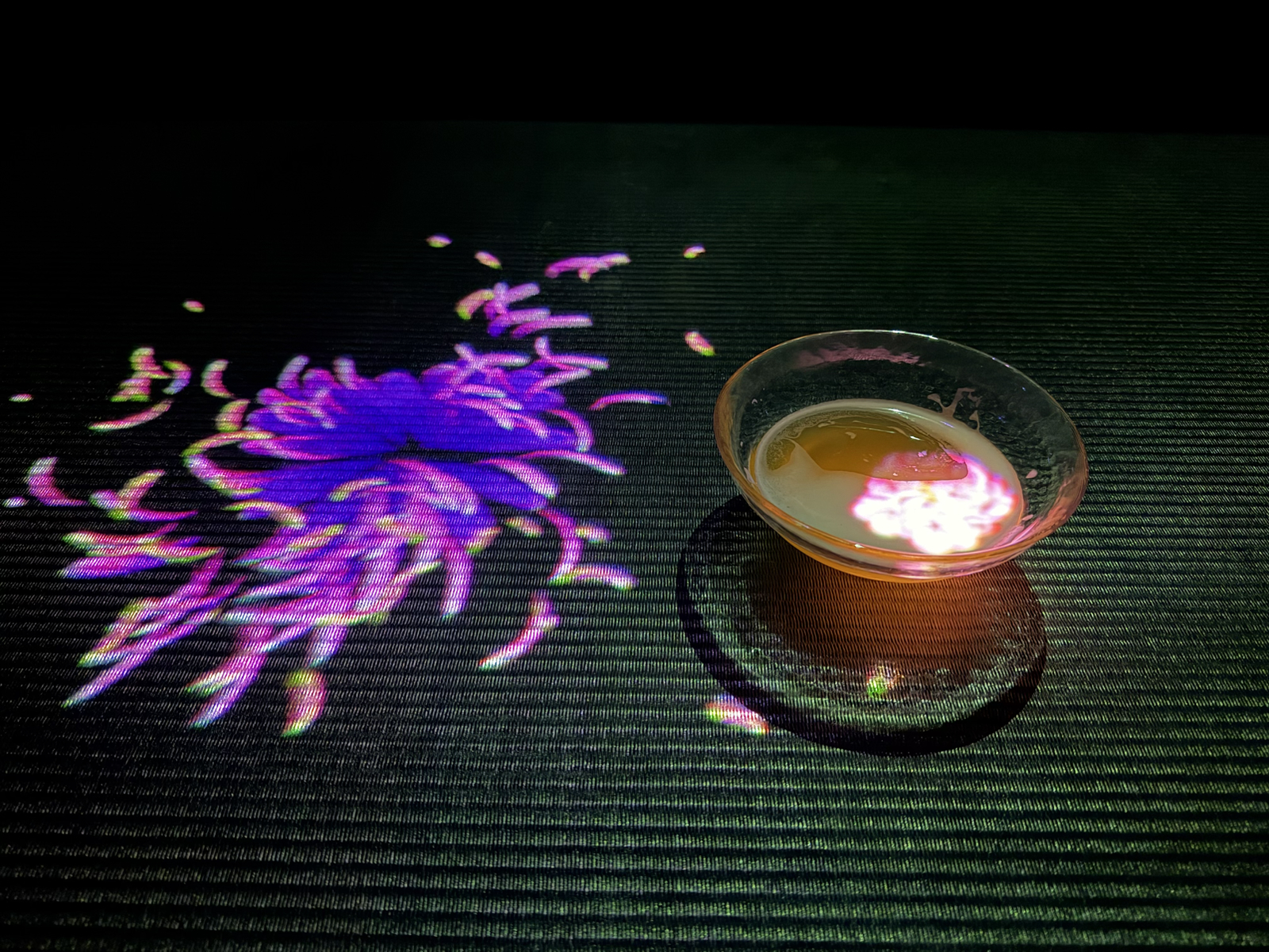They had a cafe inside where you could buy cups of tea. As with all the other rooms, it’s mostly dark inside but once the tea was placed on the table in front of you flowers bloomed inside. This was of course achieved by projectors in the ceiling but we quickly determined it wasn’t a fixed location and the projectors ‘found’ the cup no matter where you put it. Even better, if you let the flower bloom a little and moved the cup the flower would explode into petals and drift away while a new one formed. Once you drunk the tea the effect ended, which still puzzles me: how did the projectors know the tea was gone? This was impressive technology.