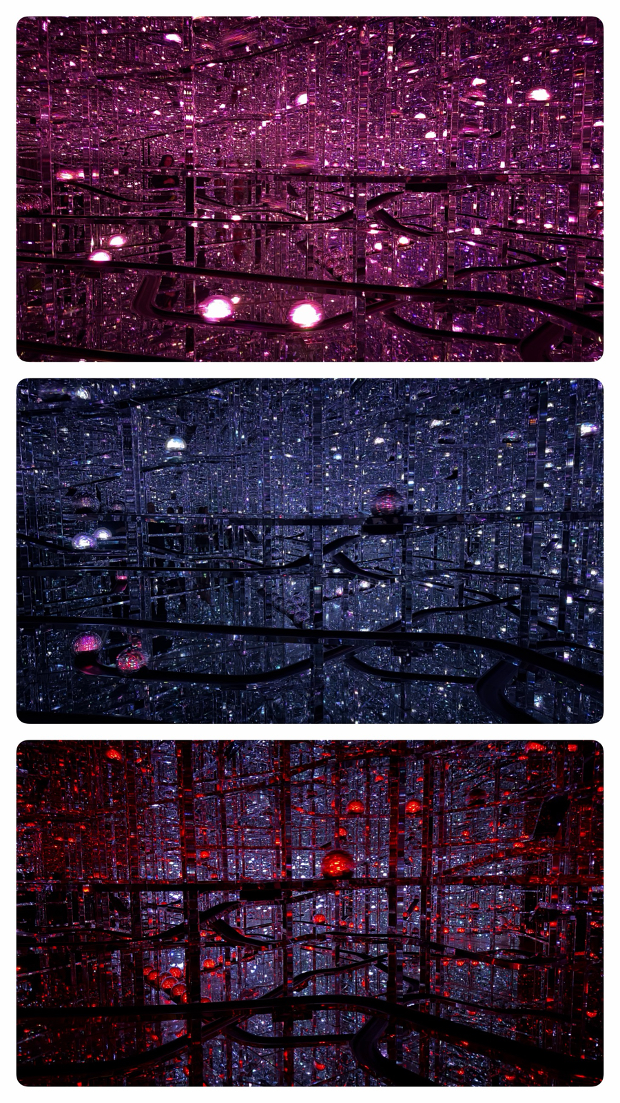 The room full of lanterns at the old Borderless had received a significant upgrade and now contained mercury lamps with LEDs inside that pulsed between various colours. The above photo may be difficult to interpret: it’s a room with the walls, floor and ceiling mirrors with these light gloves suspended from the ceiling. Walking around inside was dazzling.