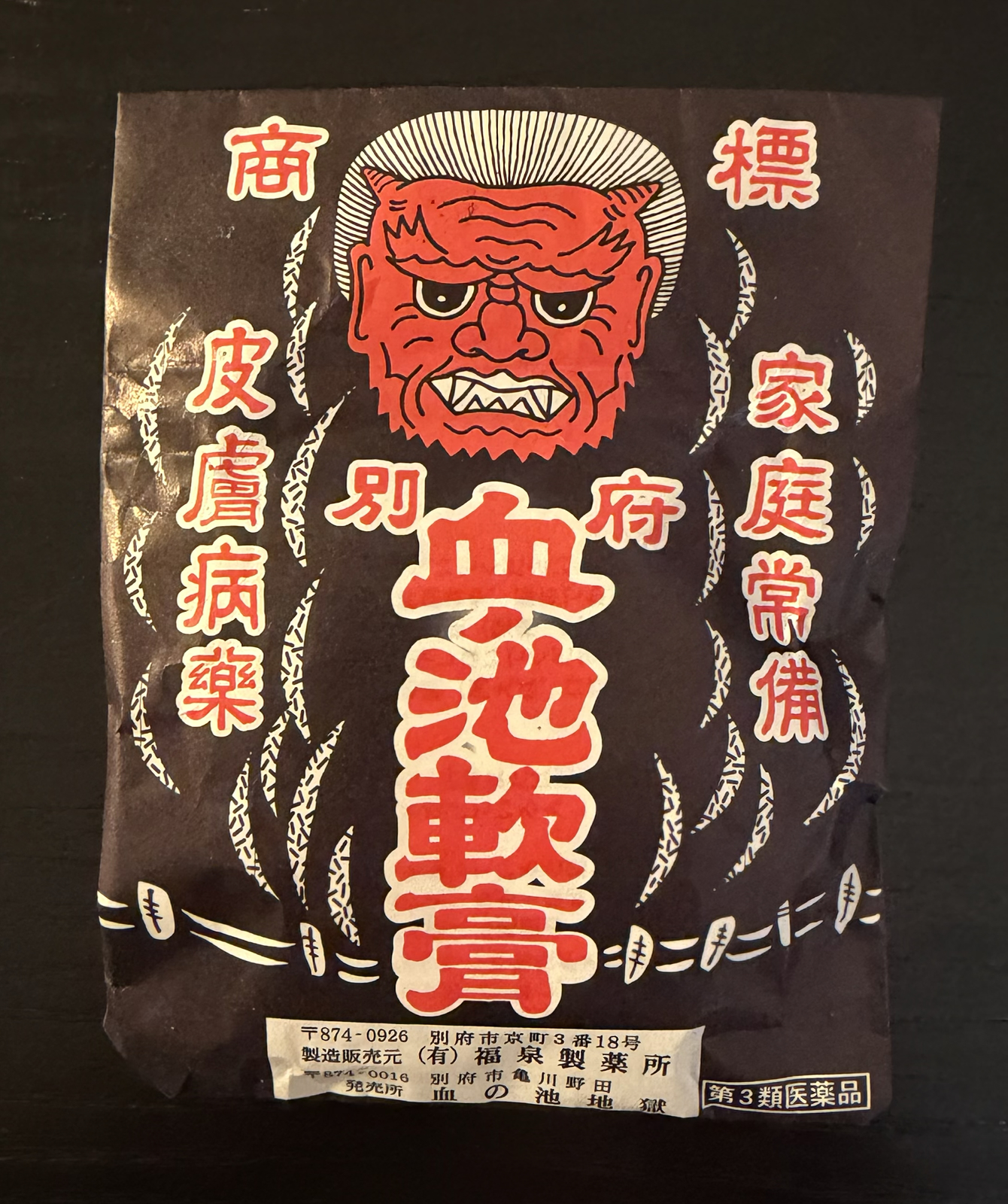 The above is ‘Blood Pond Ointment’ and was purchased at the ‘Blood Hell’ in Beppu. It’s a small pot of mud from the bottom of the red pool at the ‘Blood Hell’ (seen in this blog post) and is sold as a cosmetic item. Or maybe medicinal? We haven’t opened it yet, and before traveling we sealed the sealed paper bag in two ziplock bags since it absolutely reeks of smoke.