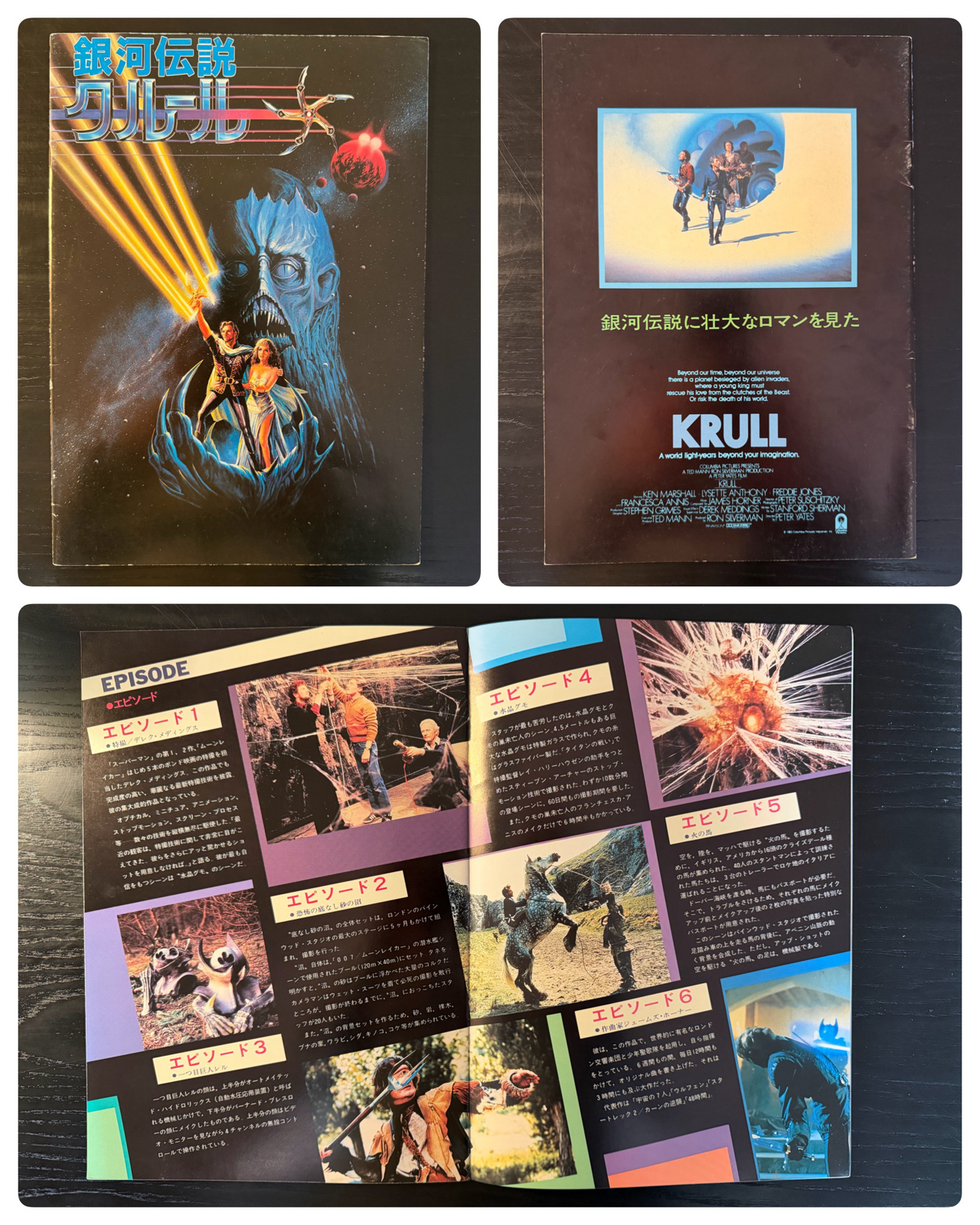 I bought this Krull movie program at a tiny used bookstore in Kobe. I only found it by accident after seeing a sign on the street, and the store was up a narrow staircase and occupied a single small room with no other door or even cupboard. An elderly man sat at a desk with a skull on it and quietly read as I browsed dense bookshelves full of magazines and movie programs.