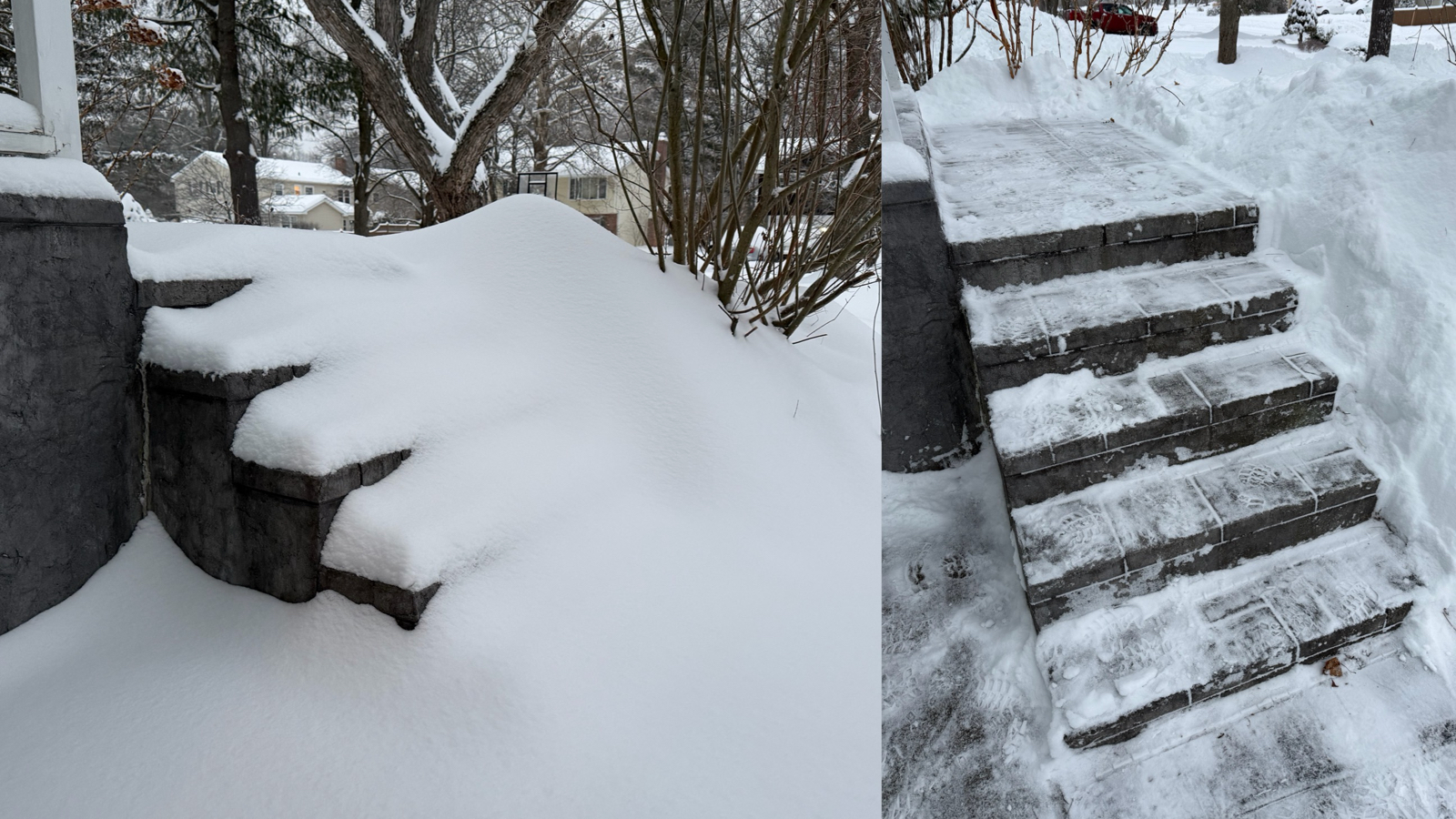 The photo on the left was Monday morning. Keep in mind that the previous afternoon I had already cleared the steps twice! There was so much snow that the usual method – just push it off the steps and patio – wasn’t an option since the snow level was higher than the patio. Clearing the steps is usually the easiest task, but yesterday it was a chore.